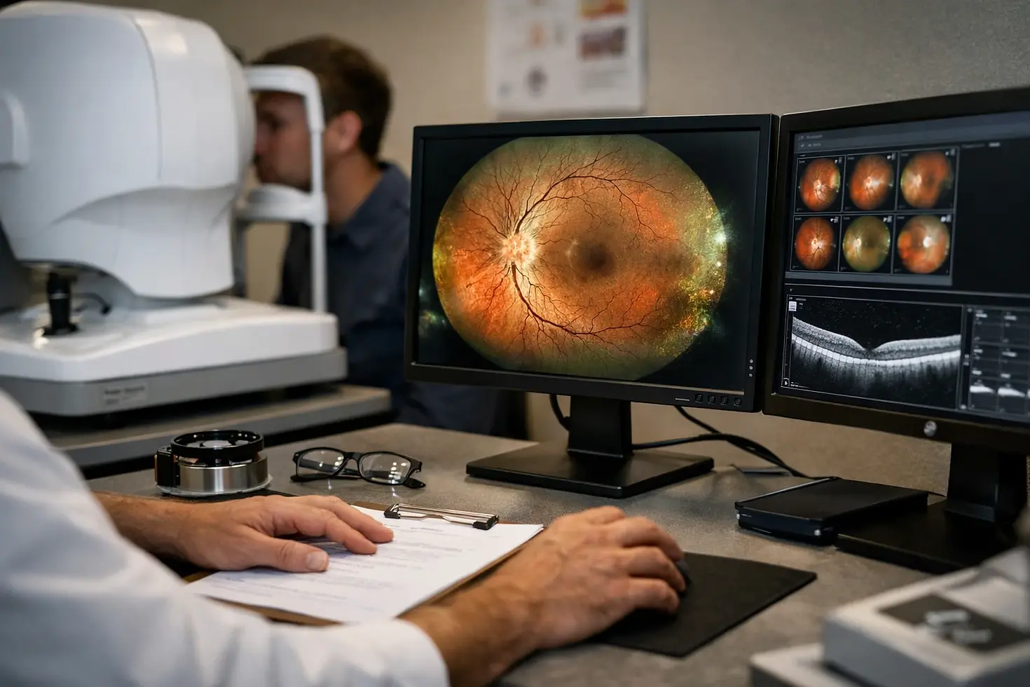 Picture a senior clinician pointing to a desktop monitor during a teaching session, comparing one retinal image against a curated set of similar cases. That is not marketing theatre. It is how pattern recognition is built responsibly.